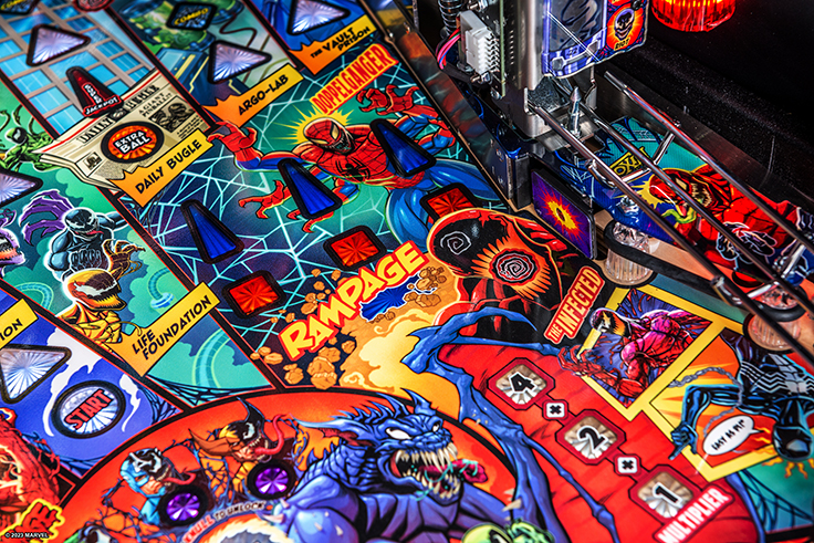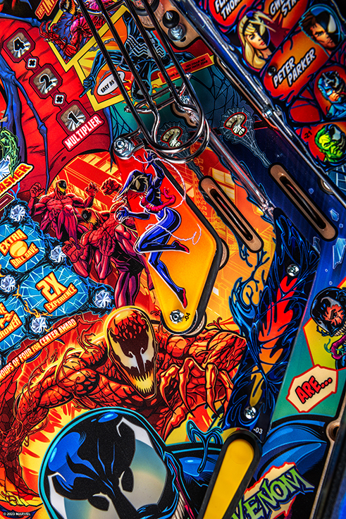 The Venom Premium Pinball Machine boasts spectacular artwork that captures the essence of Venom’s dark and dynamic universe. The cabinet is adorned with vibrant, detailed illustrations of Venom, his symbiote allies, and formidable foes. The playfield is intricately designed with thematic elements and elaborate details, immersing players in the chaotic world of Venom.